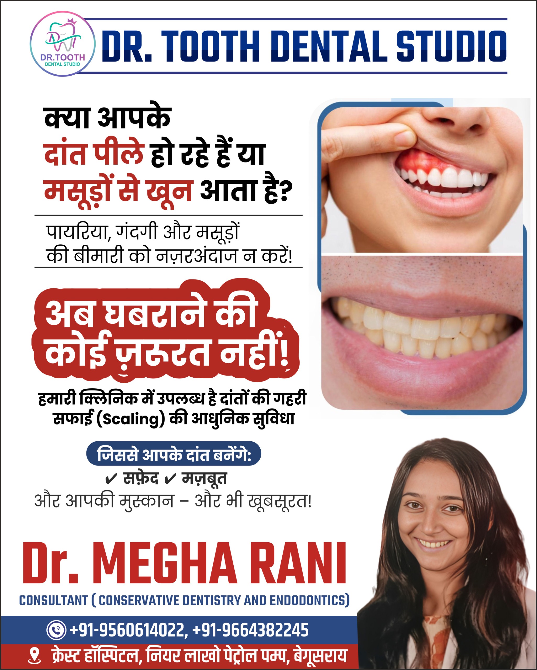 Dr. Tooth Dental Studio is a modern and patient-friendly dental clinic located at Crest Hospital, Near Lakho Petrol Pump, Begusarai. Led by Dr. Megha Rani (BDS, MDS – Conservative Dentistry & Endodontics), we provide complete and advanced dental care solutions for patients of all age groups. Our clinic combines modern equipment, strict sterilization protocols, and personalized treatment plans to ensure painless and effective dental care.