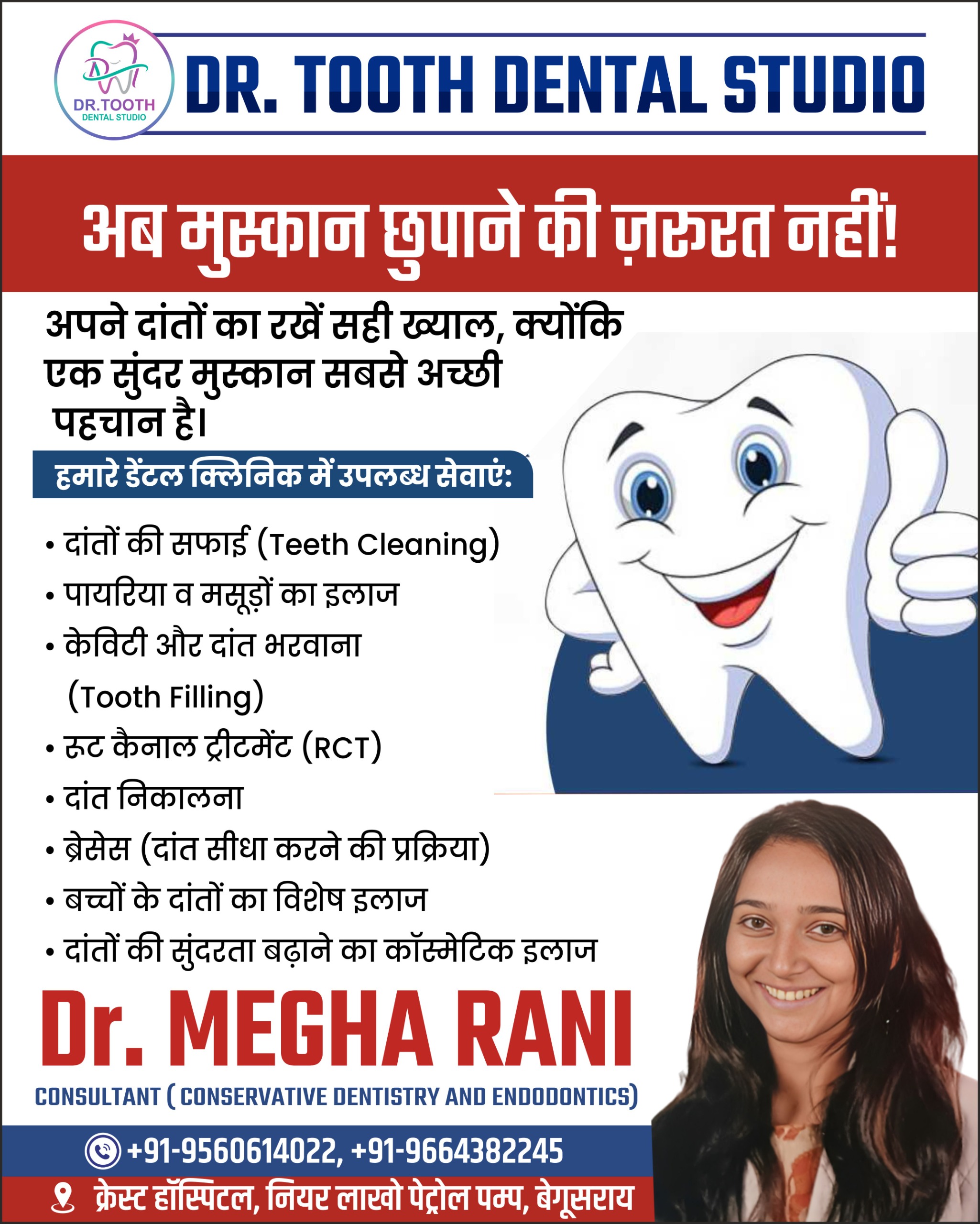 Dr. Tooth Dental Studio is a modern and patient-friendly dental clinic located at Crest Hospital, Near Lakho Petrol Pump, Begusarai. Led by Dr. Megha Rani (BDS, MDS – Conservative Dentistry & Endodontics), we provide complete and advanced dental care solutions for patients of all age groups. Our clinic combines modern equipment, strict sterilization protocols, and personalized treatment plans to ensure painless and effective dental care.